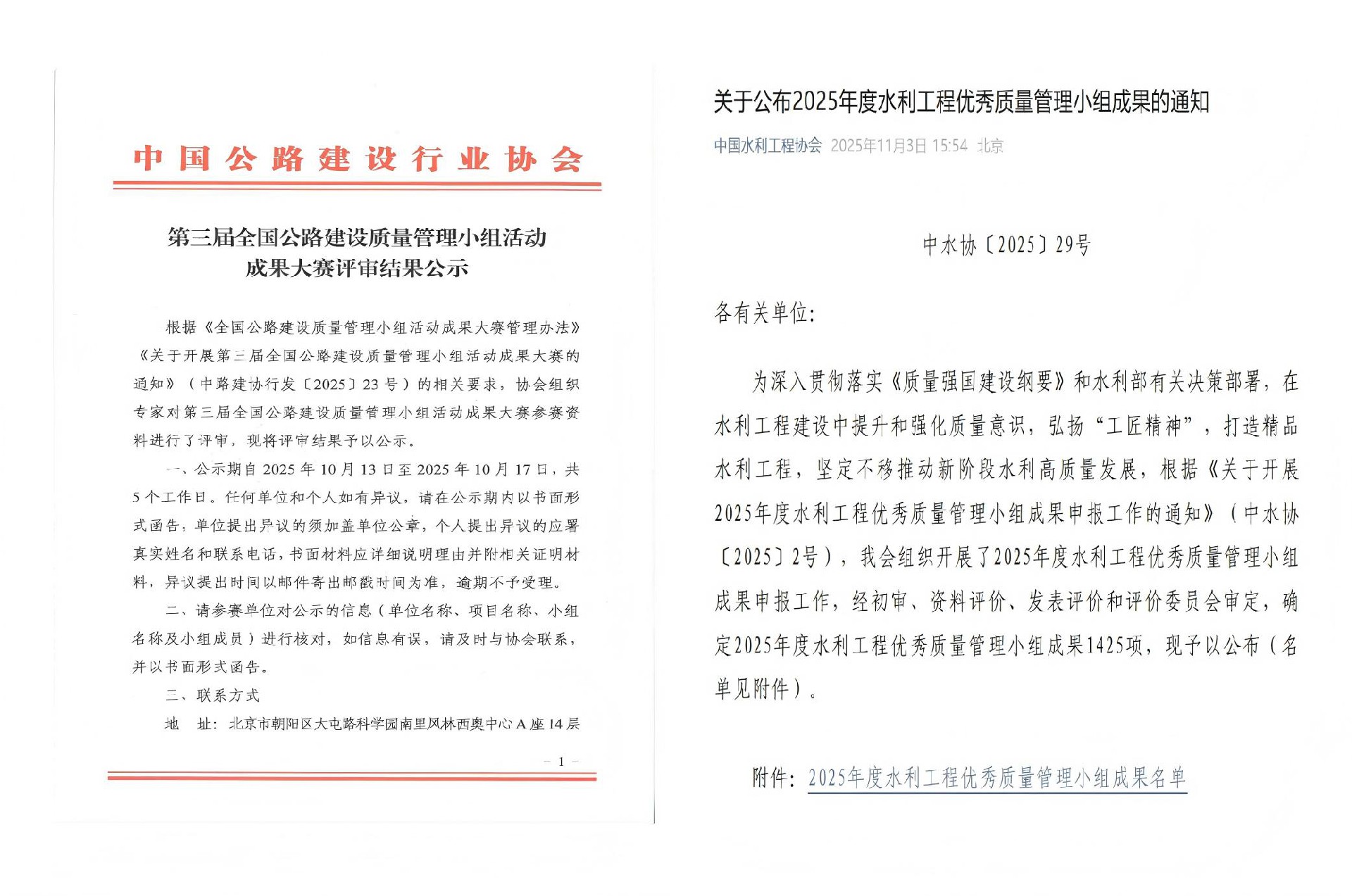 近日,中國公路建設(shè)行業(yè)協(xié)會、中國水利工程協(xié)會先后公布了第三屆全國公路建設(shè)質(zhì)量管理小組活動成果評審結(jié)果和2025年度水利企業(yè)質(zhì)量管理小組競賽活動結(jié)果。“···